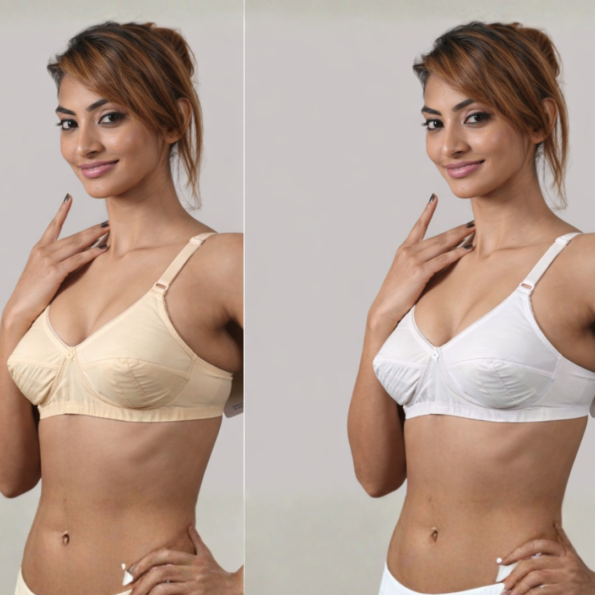 Embrace timeless comfort and excellent support with this classic, non-wired cotton bra. Designed for maximum breathability and gentle support, this bra is the perfect choice for everyday wear, especially in warmer climates. The cups are constructed with soft, breathable cotton fabric and feature subtle seaming for natural shaping and lift without the need for an underwire. The full-coverage style provides great containment and a smooth look under all types of clothing. The wide, comfortable shoulder straps are fully adjustable to ensure a personalized fit and optimal weight distribution. An elasticated band runs along the bottom, offering a secure, gentle hold. Presented in a clean, versatile white color, this bra is a foundational piece in any lingerie collection, prioritizing all-day comfort and a simple, flattering fit.