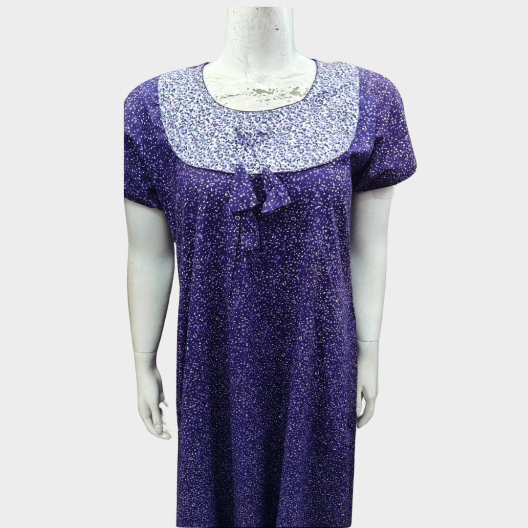 This churidar cutting nighty is designed for maximum comfort with a stylish touch. It features a soft, breathable fabric that feels gentle on the skin, making it perfect for nightwear and relaxed home wear. The round neckline with contrast yoke detailing and a small front bow adds a feminine charm. The churidar-style cutting provides a graceful fall and comfortable fit, allowing easy movement while resting or sleeping. Ideal for daily night use, this nighty combines comfort, simplicity, and elegance.