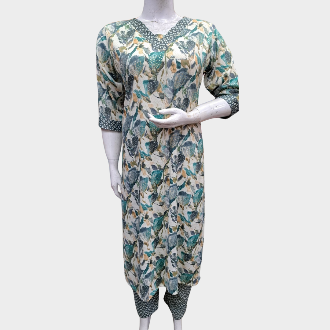 This elegant cord set features a beautifully printed kurta-style top with a rich floral pattern that adds a timeless ethnic charm. Designed with a flattering V-neckline and three-quarter sleeves, it offers a perfect balance of comfort and style. The fabric feels soft and breathable, making it ideal for all-day wear. Its graceful fit and vibrant yet classy color combination make it suitable for daily wear, office wear, casual outings, or small festive gatherings. Pair it with matching bottoms and minimal accessories for a complete, polished look.