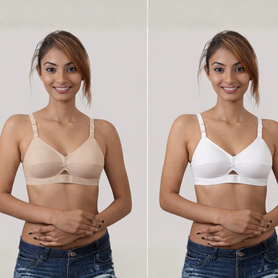 Step into modern comfort with this sleek, non-wired bra featuring a contemporary design detail. This bra is crafted from a soft, breathable white fabric, making it a fresh and practical choice for daily wear. While providing essential coverage, the design stands out with a unique criss-cross or cut-out detail at the center gore and below the bust, adding a stylish, youthful element to the classic silhouette. The cups are shaped for a natural look and gentle lift without the discomfort of underwires. Wide side wings and a secure band offer reliable support. The shoulder straps are fully adjustable, allowing for a customized and comfortable fit. Perfect for layering under deep V-neck tops or simply enjoying a stylish update to your everyday essentials, this bra merges functional comfort with modern aesthetics.