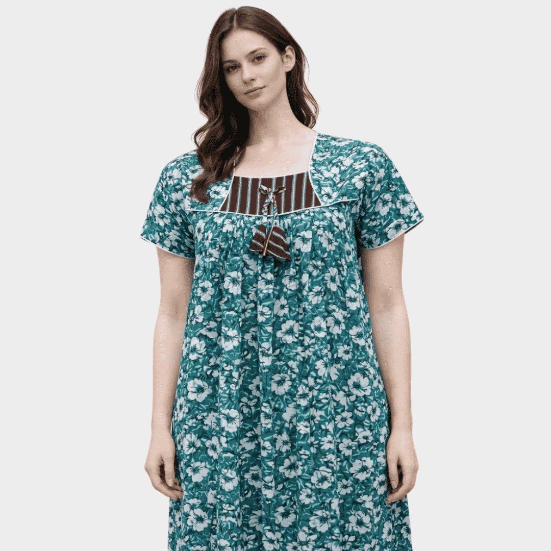 Stay comfortable and stylish with this beautifully designed teal green floral printed nighty, perfect for everyday nightwear and relaxed home lounging. Crafted from soft, breathable fabric, it offers a gentle feel on the skin and ensures lasting comfort throughout the day and night.