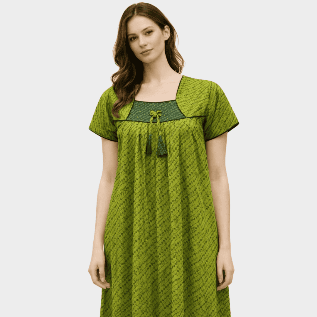 The nighty features an all-over subtle pattern in soothing green tones, complemented by a contrast yoke panel with neat piping for a refined look. A delicate front tie-up with tassel detail adds a graceful feminine touch. The relaxed, flowy silhouette and short sleeves provide ease of movement, making it perfect for daily nightwear and home lounging.