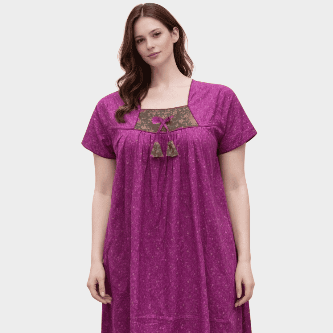 elegant and comfortable women’s nighty, designed for everyday relaxation. Made from soft, breathable fabric, it feels gentle on the skin and ensures all-night comfort. The subtle all-over print adds a refined look, while the contrast yoke panel brings a stylish highlight to the design. Featuring a square neckline with a decorative bow and tassel tie, this nighty blends simplicity with charm. Its relaxed, flowy silhouette and short sleeves make it perfect for peaceful sleep and comfortable lounging at home.