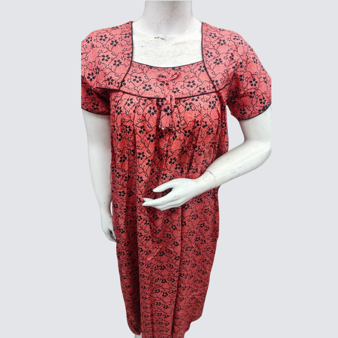 This coral pink printed nighty is designed to blend comfort with everyday elegance. Made from soft and breathable cotton fabric, it provides a gentle feel on the skin, making it perfect for all-day home wear and peaceful sleep. The all-over black floral print adds a stylish contrast, while the square neckline with neat piping enhances its overall look. Featuring short sleeves and a loose, flowy silhouette, this nighty ensures ease of movement and a comfortable fit, making it an ideal choice for relaxed lounging and night-time wear.