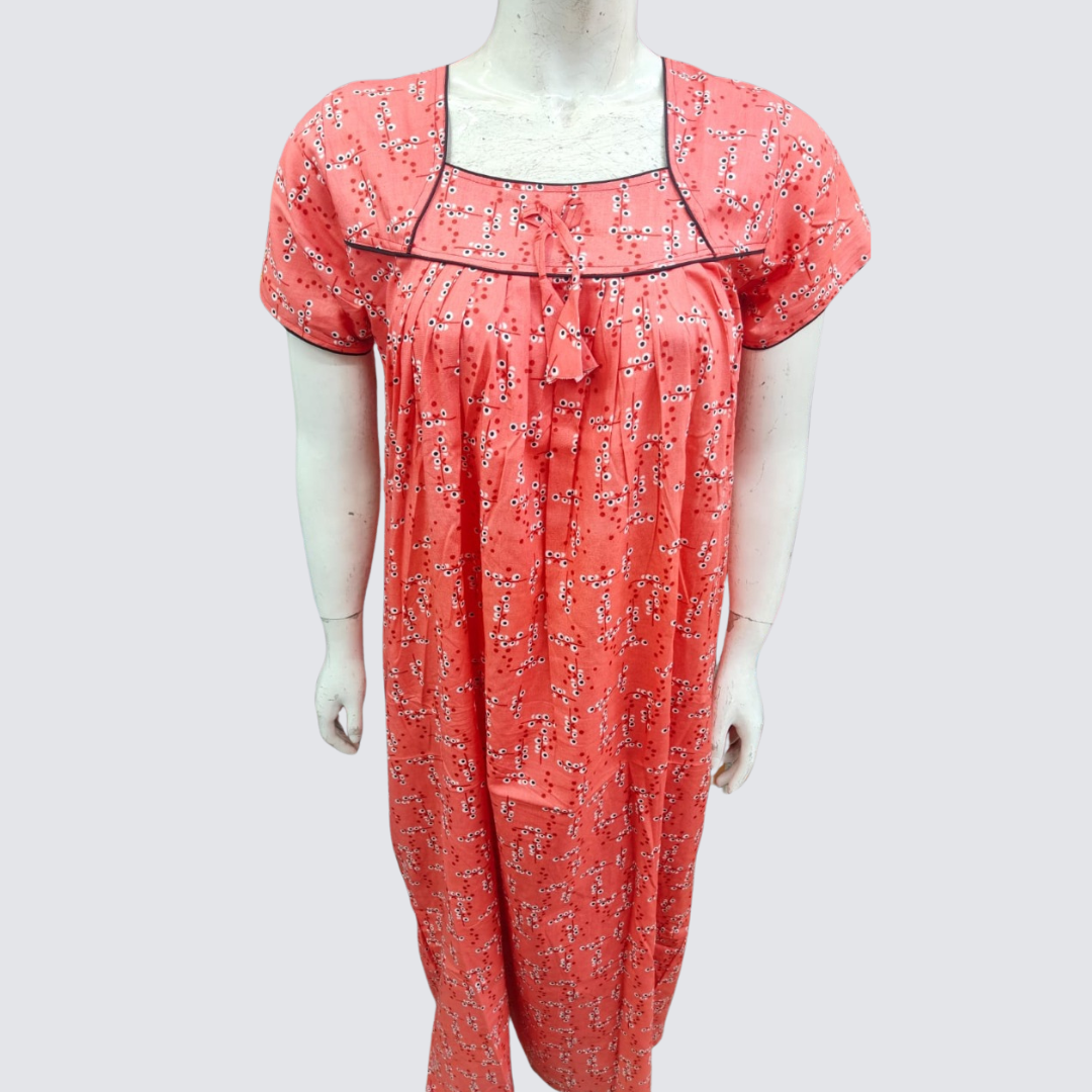 This coral peach printed nighty is crafted to provide everyday comfort with a soft and elegant look. Made from breathable cotton fabric, it offers a smooth and gentle feel on the skin, making it suitable for both nightwear and relaxed home wear. The subtle all-over print adds a charming touch, while the square neckline with contrast piping and a neat tie detail enhances its design. Featuring short sleeves and a loose, flowy silhouette, this nighty ensures easy movement and long-lasting comfort, making it a perfect choice for comfortable lounging and restful sleep.