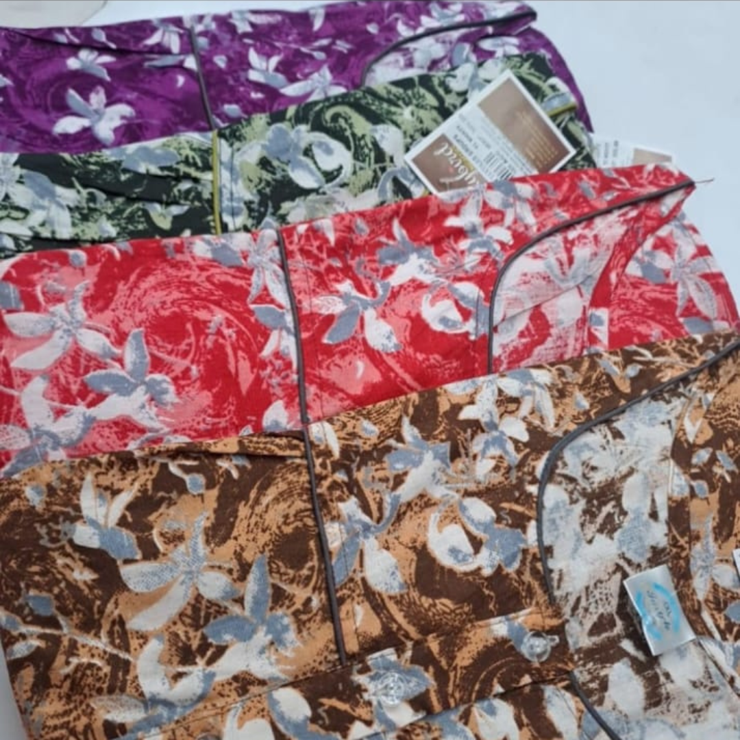 This beautiful floral printed nighty cutting is crafted from soft and breathable cotton fabric, offering excellent comfort for everyday nightwear. The elegant floral patterns combined with rich colour tones give it a stylish and graceful appearance. Designed with a front pleated pattern, it ensures a relaxed fit and ease of movement, while the contrast piping along the neckline adds durability and a refined finish. Gentle on the skin and easy to maintain, this nighty cutting is suitable for all seasons. Available in attractive colours like Purple, Olive Green, Red, and Brown, it is ideal for stitching a comfortable nighty tailored to your personal style and fit.